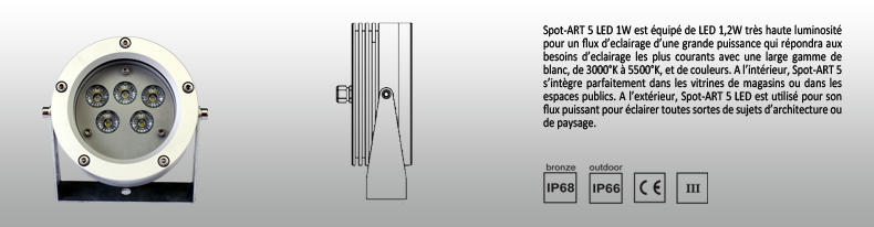 Product Spot-Art 5 LED Spot-Art 5 LED diameter : 102mm / 4,01'' depth : 67mm / 2,64'' Type of leds : 5 leds 1.2W (Red, green, blue, amber, warm white,cold white) beam : 14°, 20°, 34° Data Sheet Brochure Product Guide