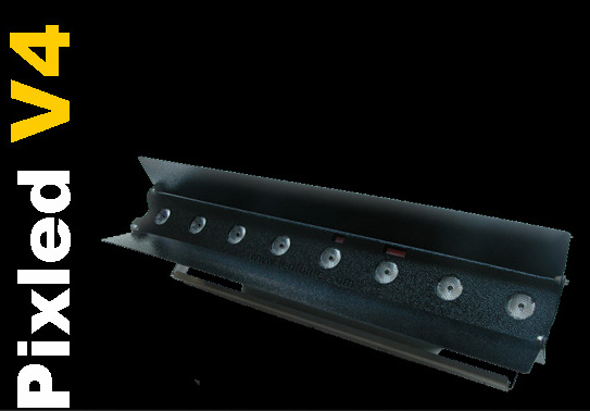 Product Pixled V4 Pixled V4 556mm(21,89'') / 8 LED RGB "3in1" length : 556mm / 21,89'' height : 235mm / 9,25'' width : 71mm / 2,8'' Type of leds : 8 leds RGB 3in1 (1,2W x 3) beam : 25° & 40° consumption : 55W Infos Fiche Catalogue Product Guide