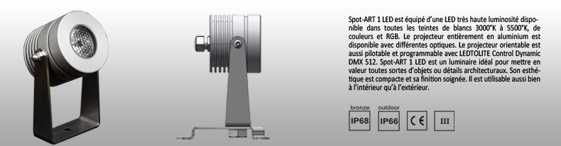 Product Spot-Art 1 LED Spot-Art 1 LED diameter : 50mm / 1,97'' depth : 46mm / 1,81'' Type of leds : 1 led 1.2W or 3W (Red, green, blue, amber,warm white,cold white) or 1 led 1.2 RGB "3in1" beam : 10° (except "3in1"), 25°, 40° consumption : 2W or 4W Data Sheet Brochure Spot 1 LED 1W and "3in1" Brochure Spot 1 LED 3W Product Guide Spot 1 LED 1W and "3in1"5 Product Guide Spot 1 LED 3W